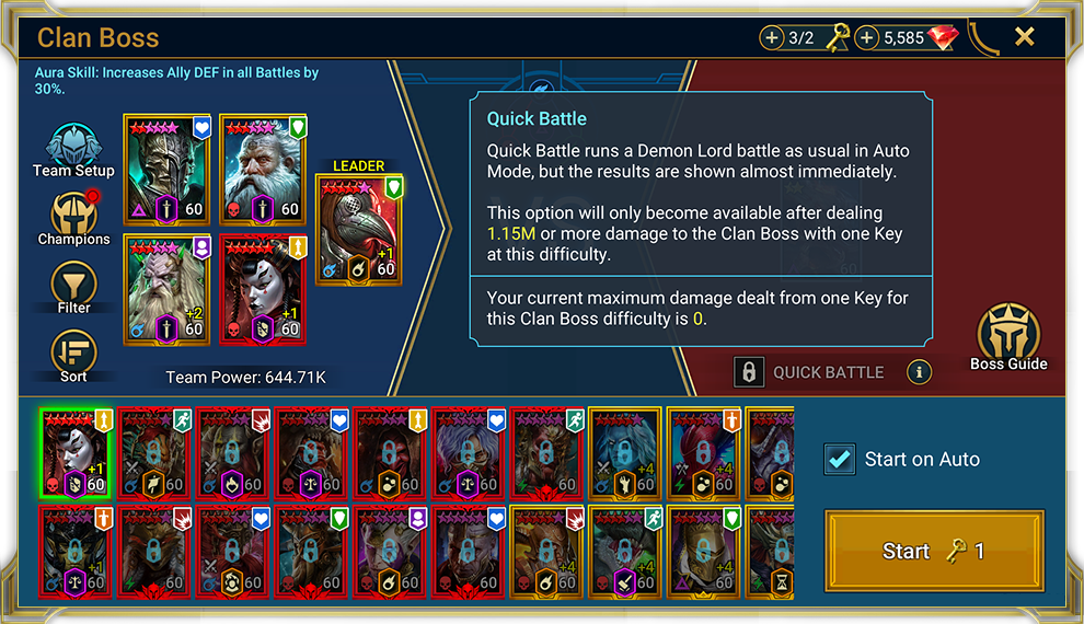 クイックバトルを解放するには、1本のデーモンロードの鍵を使用し、指定されたダメージ量を与える必要があります。解放に必要なダメージ量は、その難易度でのデーモンロードの最高価値の「宝箱」を得るために必要となるダメージ量と同等です。