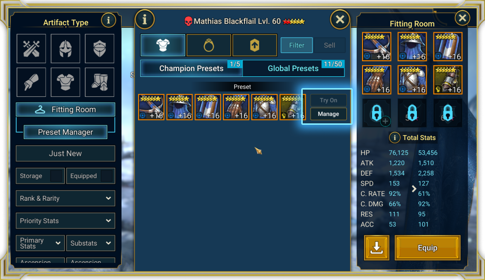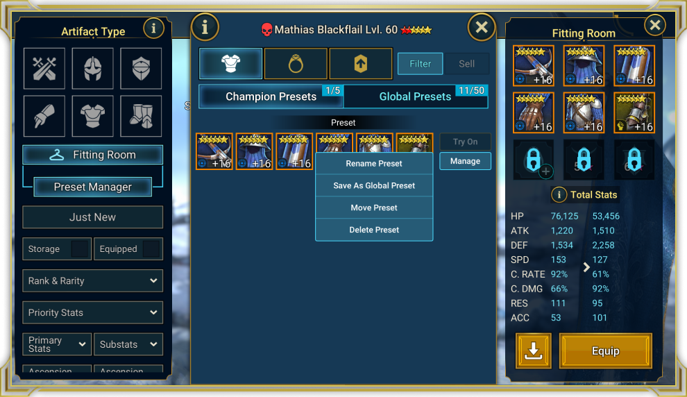 최고의 유물과 장신구로 구성된 장비 프리셋을 생성해 챔피언에게 특정 전투에 필요한 특정 장비를 빠르게 장착할 수 있습니다. 유물 프리셋은 유물을 최대 6개, 장신구 프리셋은 장신구를 최대 3개 저장할 수 있습니다. 같은 유물과 장신구여도 다른 프리셋에 사용할 수 있고, 프리셋마다 고유 이름을 설정해 필요한 장비를 쉽게 찾을 수 있습니다.
