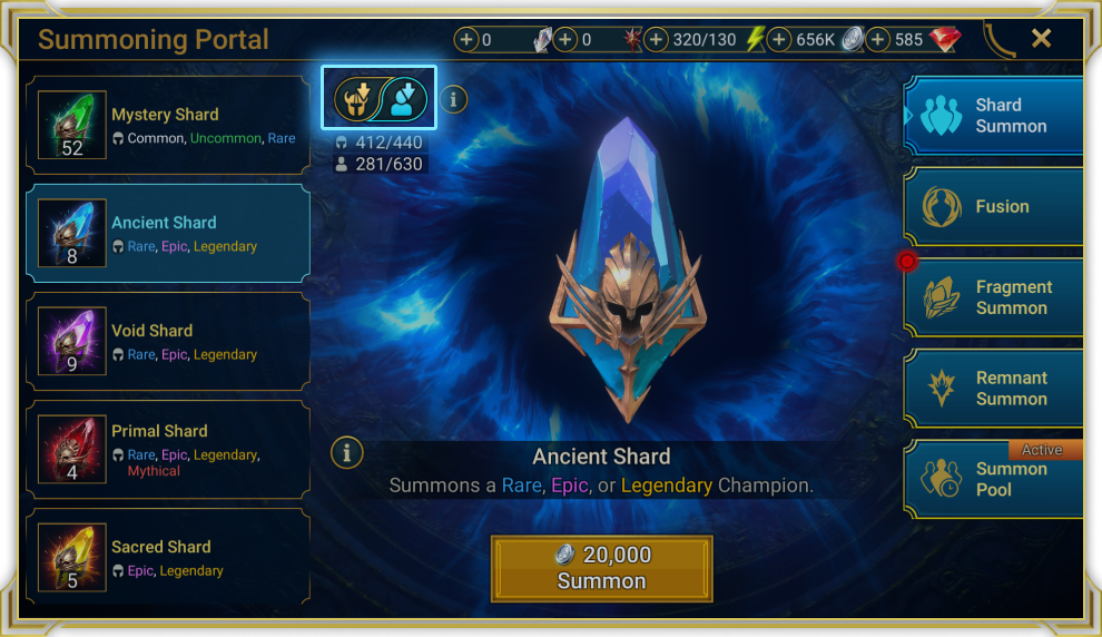 포탈에서 새로운 챔피언 소환 위치를 정할 수 있습니다. 기본적으로 새로운 챔피언은 챔피언 목록으로 즉시 보내집니다. 레벨 60을 달성하면 포탈에서 예비 금고로 챔피언을 바로 소환하는 옵션으로 변경할 수 있습니다. 해당 옵션은 모든 파편 종류에 적용할 수 있습니다.