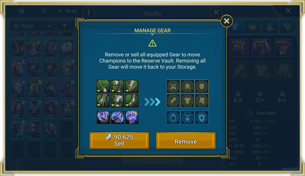 주요 금고와 예비 금고에 있는 챔피언 모두 전투에 참여할 수 있지만, 예비 금고에 있는 챔피언은 장착된 장비가 하나도 없어서 사용하지 않는 게 좋습니다.