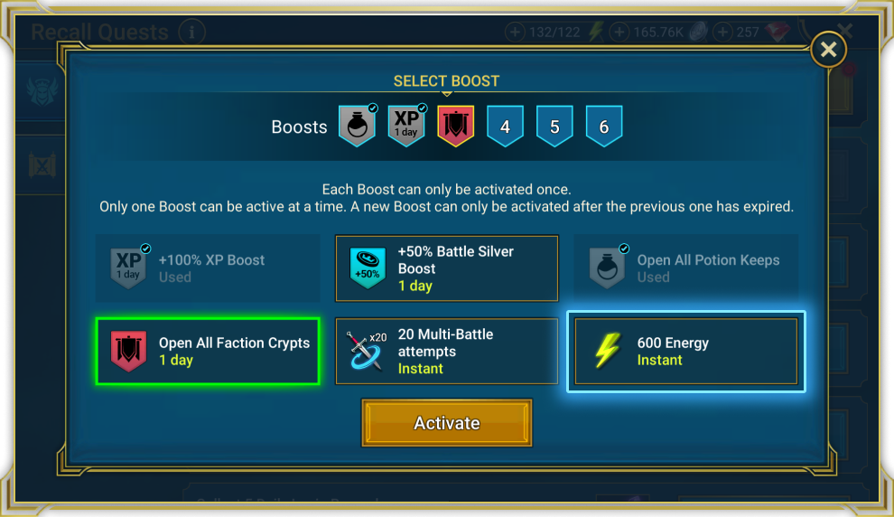 복귀 유저에게는 일회에 한해 특별한 6가지 부스터가 제공됩니다. 한 번에 부스터 한 개만 활성화됩니다. 부스터 종류: