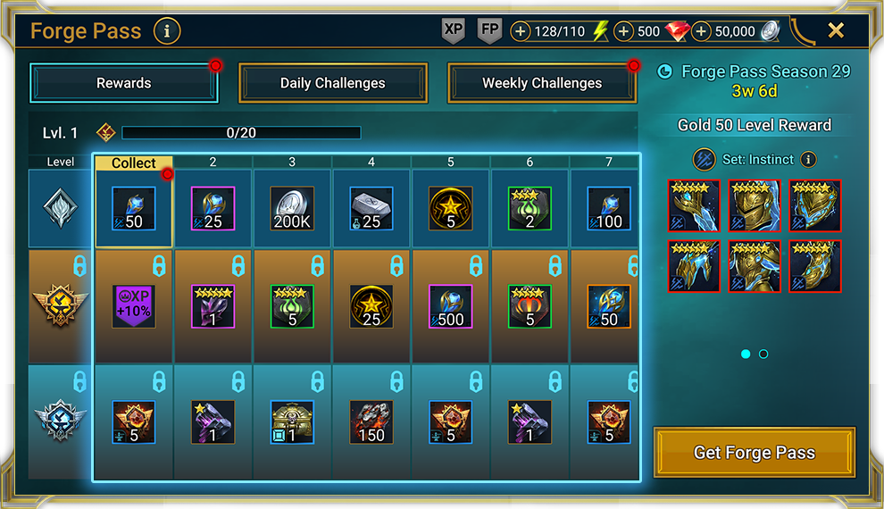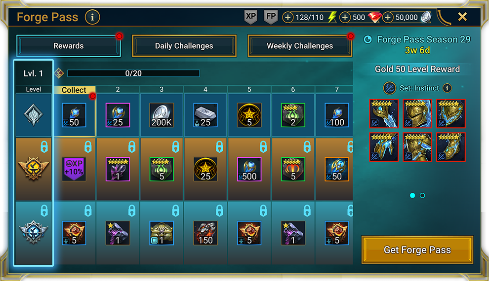 골드 대장간 패스로 코어 패스의 모든 혜택과 더불어 주간 챌린지를 완료하고 골드 대장간 패스 보상을 받을 수 있습니다. 추가로 시즌 동안 모든 전투에서 보너스 실버와 XP를 제공하는 레이드 부스트도 받습니다.