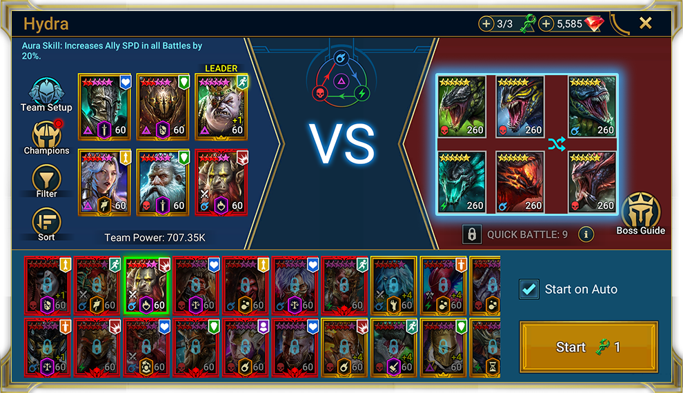 Observação: o cálculo do resultado da Batalha Rápida contra a Hidra pode levar vários minutos, dependendo do número de turnos que sua equipe conseguir sobreviver.